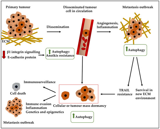 For tumour cells to successfully metastasise, they must survive conditions without a stable ECM contact, where integrin and growth factor signalling is compromised. In normal cells, an aberrant ECM attachment triggers anoikis (programmed cell death), however, tumour cells employ mechanisms that resist anoikis as well as autophagy [64,84,85,86]. Failure of DTCs to engage with a new ECM has been shown to trigger tumour dormancy Specifically, inhibiting β1 integrin signalling promoted dormancy by elevating autophagy in the mouse mammary tumour virus-polyoma middle tumour-antigen (MMTV-PyMT), a mouse mammary gland carcinoma model of BC [64,84,85,86]. This autophagy upregulation allowed BC cells to establish cell-ECM contacts necessary to survive at secondary sites (Figure 2). Moreover, an increased autophagic flux, maintained BC dormancy via downmodulation of E-cadherin, a major component in cell-cell adhesion and epithelial tissue homeostasis and whose downregulation is linked to tumour progression (Figure 2) [64,84,85,86]. Therefore, autophagy upregulation in ECM-detached cells may compensate for the loss of extrinsic signals, thereby promoting nutrient and energy metabolism and maintenance of the dormant state [64,84,85,86].