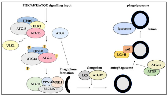 Key players of autophagy comprise over 30 autophagy-related (ATGs) genes. These genes are implicated in the process of autophagy, including the autophagosome initiation step, in which ULK1/ATG13/FIP200 released ULK1 in an mTOR-mediated manner [96]. Subsequently, the autophosphorylation of this complex is linked to the addition of ATG9 to the phagophore. Further, an isolation membrane coated by Beclin-1/ATG14L/VPS34/VPS15 complex is formed. The autophagosome elongation step is mediated by LC3 and ATG12, followed by cleaving and activation of each molecule, respectively. Then, ATG5/ATG12 facilitate the coating of the autophagosome by p62/SQDTM1 bound LC3-II. The autophagosome then fuses with a lysosome [96,97] (Figure 3).