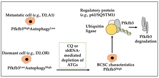 Many metabolic processes may be linked to autophagy in dormant cells. The critical glycolysis mediator 6-phosphofructo-2-kinase/fructose-2,6-biphosphatase 3 (Pfkfb3) was investigated and showed its expression to correlate inversely with autophagy levels where dormant D2.OR cells display a Pfkfb3LowAutophagyHigh phenotype, while their metastatic D2.A1 counterparts display a Pfkfb3HighAutophagyLow phenotype [83,110]. Indeed, inhibiting autophagy in D2.OR cells, either with chloroquine (CQ) or shRNA-mediated depletion of ATGs, induced BCSC expression of Pfkfb3 and emergence of metastatic dormancy [83]. Moreover, the study found that Pfkfb3 is an autophagy substrate that binds to p62/SQSTM1 (a ubiquitin-binding scaffold protein), highlighting that autophagy activation contributed to metastatic dormancy partly by enabling p62/SQSTM1-mediated degradation of Pfkfb3, underlining metabolic properties of dormant cells (Figure 4) [83]. Moreover, hypoxia is also known to induce tumour cell dormancy, and de Prati and colleagues have found that under chronic hypoxia, metastatic BC cells enter into a dormant state where AMP-activated protein kinase (AMPK) activation and increased autophagy levels sustained their survival [35]. In our opinion, the increase in metabolic outputs and hypoxia-induced autophagy can impact dormancy and dormant cell awakening.