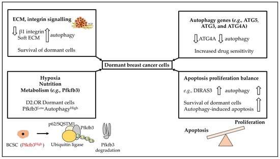 The summary of the contribution of autophagic processes to dormant cells. Autophagy, through its various associated genes and players including but not limited to ATG5, ATG3 and ATG4A can impact dormancy. For example, the downregulation of ATG4A can lead to reduced autophagy and increased drug sensitivity in BC cells (and reduced dormancy). Furthermore, autophagy can impact the balance of apoptosis and proliferation, for example, DIRAS3 upregulation could increase autophagy, dormant cell survival and also cell death due to autophagy. Moreover, autophagy is linked to metabolism, nutrition and hypoxia and through this can impact dormant cells, for instance, dormant BC cells could downregulate Pfkfb3, a gene involved in metabolism. As discussed earlier, inhibiting autophagy induced BCSC expression of Pfkfb3 and the emergence of metastatic dormancy, while Pfkfb3 protein could be degraded by p62 and ubiquitin ligase complexes. Finally, loss of contact with other cells and the basement membrane (for example through integrin and E-cadherin downregulation) in addition to a soft ECM can increase autophagy levels and enhance dormancy.