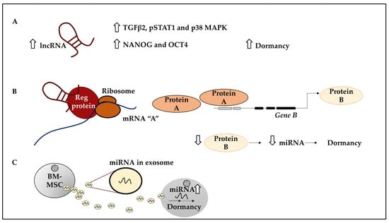 Underlying mechanisms of action of lncRNAs in inducing dormancy in BC. (A) Increased levels of lncRNAs (for example, NF2R1-AS1) can lead to increased levels of dormancy mediators including TGFβ2, pSTAT1 and p38 MAPK, while stemness markers such as OCT4 and NANOG may also be increased. (B) LncRNAs (for example, NF2R1-AS1) can promote metastatic dormancy by binding to a regulatory protein (for example, PTBP1) which can increase the translation of mRNA A and the production of protein A. Protein A (for example, NR2F1) per se can reduce the transcription of gene B (for example, TP63). Reduced levels of protein B (for example, ΔNp63) can lead to the modulation of regulatory miRNAs (for example, miR205) influencing dormancy. (C) Exosomes produced by BM-MSCs containing miRNA that influence BC cell dormancy.