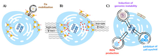 Remarkably, the treatment of the cells with AuNP-BBN led to a much stronger influence of the dose rate on the survival of the irradiated PC3 cells, as well as on their genomic instability. In fact, the use of the highest dose rate of 1 Gy/min lead to a much lower survival fraction (<5%) and more complex genomic damage, as evidenced by an increased number of multiple Mni per BN cell (Figure 8 and Figure 9). Thus, these results show that the flux of photons hitting the PC3 cells has a strong influence on the radiosensitizing effects exerted by the AuNP-BBN nanoparticles, undergoing a high specific uptake by these tumoral cells. Most probably, the irradiation at lower dose rates leads to the emission of a minor number of electrons (e.g., photoelectrons or Auger electrons) per unit of time upon excitation of the Au atoms and, ultimately, to less ROS production. Under these circumstances, it is more probable that DNA damage repair has a better ability to compete with production of lethal DNA lesions, therefore leading to reduced cell killing. Besides these physical effects, chemical and biological factors should also be considered to explain the enhanced radiosensitizing capabilities exhibited by AuNP-BBN. For instance, as discussed above, we have shown that AuNP-BBN promotes the Ca2+ mobilization in PC3 cells, and there is a Ca2+-ROS relationship that reflects the ability of Ca2+ to regulate the cellular redox environment. On the other side, metallic NPs can inhibit antioxidant enzymes such as thioredoxin reductase (TrxR), as reported by other authors [49,50,51,52]. Thus, the AuNPs may be serving a dual function by increasing ROS production as well as inhibiting the enzymatic systems responsible for the reduction in oxidative stress in the cells, and consequently leading to cell death. All in all, this hypothesis is very well-fitted to our results since a greater radiosensitizing effect was expected when the dose rate was decreased due to the weakening of the antioxidant defense system.