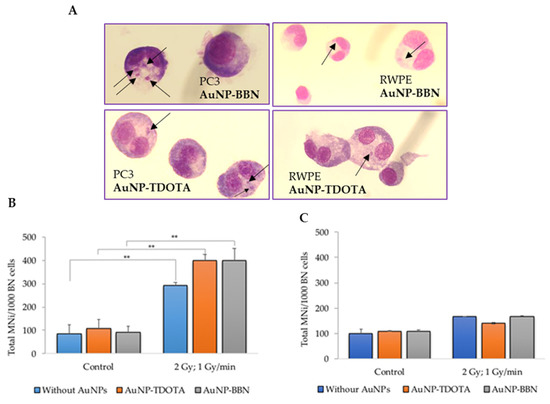 We next investigated whether the cell survival and cellular uptake results were correlated with the induction of genomic instability, using the cytokinesis-blocked micronucleus (CBMN) assay, as described in the literature [36]. Micronuclei (MNi) are extranuclear bodies that form during anaphase, as a result of unrepaired chromosome breaks, DNA misrepair or formation of acentric chromosome fragments, namely upon cell exposure to ionizing radiation. The cells were exposed to 2 Gy of γ-radiation (Co-60, with a dose rate of 1 Gy/min) after incubation with both compounds, AuNP-TDOTA and AuNP-BBN. The results are expressed as the total number of MNi per 1000 binucleated (BN) cells (Figure 5B,C).