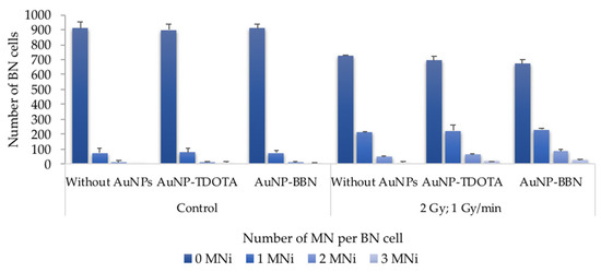 For the PC3 cell line, the results reveal a significant increase in the total number of MNi in irradiated cells when compared with non-irradiated cells, incubated or not with the AuNPs (Figure 5B). Such an increase did not occur in the RWPE-1 cells (Figure 5C). Of note is the fact that no statistical difference in the MNi number was observed in PC3 cells treated with AuNP-TDOTA or AuNP-BBN and irradiated with γ-photons. However, observing the distribution of the MNi per 1000 BN cells (Figure 6), we noticed complex DNA damage, evidenced by the occurrence of multiple MNi per BN cell in the case of PC3 cells irradiated with a 2 Gy dose, after exposure to AuNP-BBN.