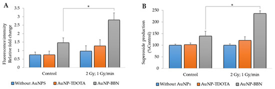 ROS production in PC3 cells after irradiation with 2 Gy of γ-radiation (dose rate of 1 Gy/min) and incubation with AuNP-TDOTA and AuNP-BBN at a concentration of 36 µg Au/mL: (A) peroxides (H2O2 and HO•) and (B) superoxide (O2•–). Statistical significance was calculated using two-tailed Student’s t-test with irradiation-only cells as the control (* p ≤ 0.05) The results were calculated from independent biological replicates and are given as the mean ± S.E.M.
