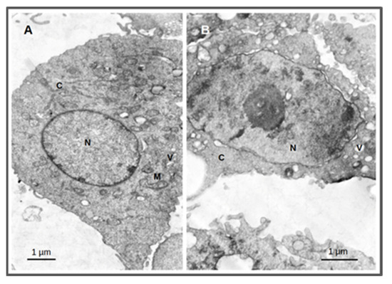 Thin-section transmission electron microscopy images of PC3 cells treated for 4 h with AuNP-BBN at a concentration of 36 µg Au/mL followed by irradiation with 2 Gy (1 Gy/min). Samples were analyzed and photographed in a JEOL 1200-EX electron microscope. Irradiated PC3 cells (A); irradiated PC3 cells after incubation with AuNP-BBN. (B); N = nucleus; C = cytoplasm; M = mitochondria; V = vacuoles. Bars = 1 micrometer.