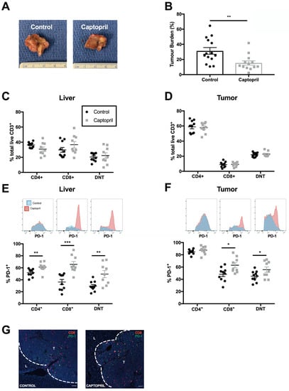 Renin–angiotensin system inhibitors (RASis), commonly used to treat cardiac failure and hypertension, have been shown to prolong survival, improve response to neoadjuvant therapy, and reduce recurrence in a range of solid cancers [,,]. Studies have reported that RASis exhibit a range of antitumour activities, including immunomodulatory, antiproliferative, and antiangiogenic effects [,,]. Additionally, we recently reported that one type of RASi, captopril, exhibits its antitumour effects in the regenerating liver via c-myc and cyclin D1 downregulation []. In the non-regenerating liver, it has been shown that RASi therapy reprograms the adaptive antitumour immune response by enhancing populations of CD8+ cytotoxic and CD4-CD8- (double-negative (DN)) T cells []; however, it is not known if these changes are also observed in the regenerating liver. To address this question, this study investigates the effect of captopril in the regenerating liver, on both innate and adaptive immune responses, using a model of CRLM and partial hepatectomy, which closely mimics the clinical scenario in which patients undergo liver resection for CRLM when clinically undetectable micrometastases may be present in the FLR.