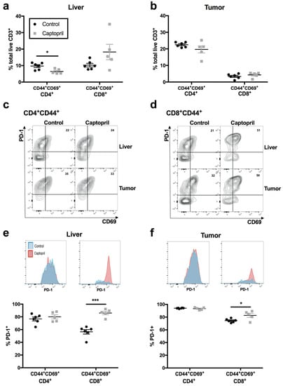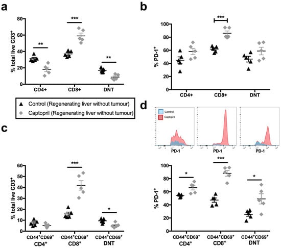The proportion of DN T cells co-expressing CD44 and CD69 (Figure 3a, “DN TRM-like”) in captopril-treated regenerating liver tissue significantly increased, and this corresponded with an increase in PD-1 expression on DN TRM-like cells in captopril-treated regenerating liver and tumour (Figure 3c,d).