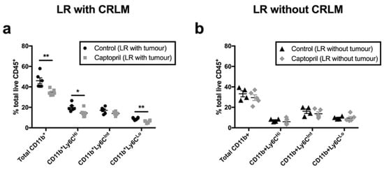 Notably, populations of MDSCs were higher in the presence of CRLM, compared with those in the absence of CRLM (control mean with tumour, total CD11b+ = 46% vs. control mean without tumour, total CD11b+ = 33%) (Figure 5a,b). Interestingly, captopril treatment reduced these populations in the presence of tumour (captopril mean total CD11b+ = 34%, Figure 5a), back down to the baseline level observed in the regenerating liver in the absence of CRLM (Figure 5b). Taken together, these findings highlight that, although the MDSCs present in the tissue respond by upregulating PDL1 expression, the sum effect of captopril is to reduce the presence of MDSCs.