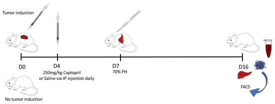 Experimental methodology. Mice were allocated to either tumour induction or no tumour induction groups, and this was performed on Day 0. From Day 4 to Day 16, half the mice in each group received treatment with intraperitoneal injections of captopril 250 mg/kg/day and the other half received intraperitoneal injections of saline (control). On Day 7, all mice underwent a 70% partial hepatectomy. Mice were culled on Day 16, and liver and tumour (if applicable) samples were retrieved for analysis.