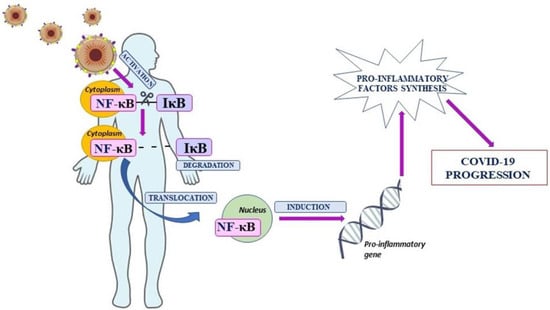 It is well known that NF-κB is involved in inflammation, and the increased inflammatory response dependent on the SARS-CoV-2 dose was observed. Abnormal activity of NF-κB is accompanied by the increased release of proinflammatory factors, including cytokines. The cytokine storm can lead to development of inflammation and COVID-19 progression. Contrarily, reduced activity of NF-κB may inhibit cytokine release and development of SARS-CoV-2 infection. Therefore, it was suggested that anti-SARS-CoV-2 therapy should focus on inflammatory response extinction through, inter alia, modulation of NF-κB [,,,,,].
