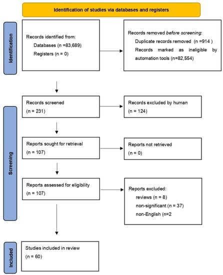 We performed a comprehensive literature search covering the period up to the 15 April 2022. We used the MEDLINE/PubMed database with the following search strategy: key word “NF-κB” (83,689 studies). Then, we used the key words “NF-κB AND COVID-19”, and a total of 231 papers were found. In the next step, we limited studies to studies in English, and we excluded duplicates or all non-significant papers (i.e., papers that did not concern NF-κB or COVID-19). Finally, 60 publications were included in the review. All steps are presented in the PRISMA Flow Diagram (Figure 2) [].