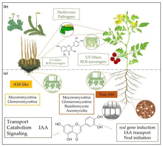 Flavonoids played multiple functions during the establishment of plants on land and their subsequent spread to harsh terrestrial habitats. (a) We hypothesize that the successful adaptation of plants on soils largely deficient in water and nutrients was favored by the arbuscular mycorrhiza-like association (AM-like) between early bryophytes and both Glomeromycota and Mucoromycota fungi, assisted by flavonoids. Flavonoids primarily act in modulating auxin transport, catabolism, and hence IAA-signaling during AM-like establishment. Arbuscular mycorrhiza (AM) is an ancient robust trait of land plants since >80% of extant land plants form true AM with a wide range of AM fungi (Glomeromycota, Mucoromycota, Basidiomycota, and Ascomycota). Similar action modes well explain the essential roles of flavonoids in the nodulation observed in a range of angiosperms since these compounds act in Nod initiation by inducting nod genes, besides acting in IAA transport. (b) Flavonoids also played pivotal roles in early land plants exposed to a novel set of stressful agents associated with the terrestrial habitat, of both abiotic and biotic origins. These functions include the screening of the shortest (UV) solar wavelengths, the scavenging of high light-induced reactive oxygen species (ROS), and the protection against a new set of pathogens and predators. Here we have reasoned that absorption of UV-B radiation and ROS scavenging increased in significance following the evolution of flavonoid metabolism and the increased complexity of land plants.
