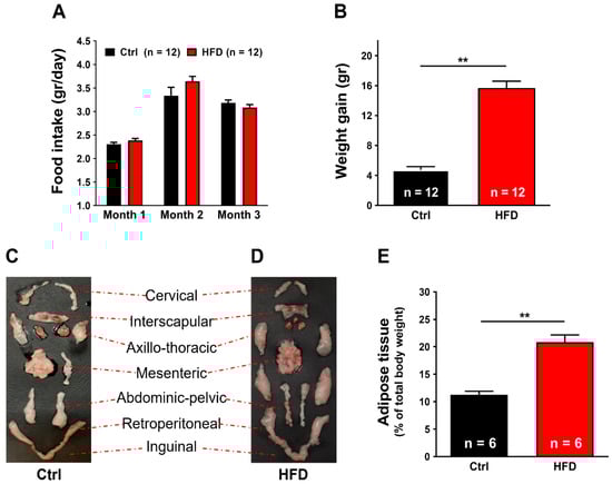 Food intake, weight gain, and body fat mass. (A) Food intake during the 3 months of HFD treatment (1–4 months of age). (B) Weight gain during the 3 months of HFD treatment. (C,D) Representative dissection of the total adipose tissue, from Ctrl (D) vs. HFD (D) mice. (E) Amount of adipose tissue expressed as percentage of total body weight. Data are shown as mean ± SEM (** p < 0.01, as evaluated by two-tailed unpaired Student’s t-test). n = number of mice tested.