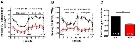 VO2 consumption, respiratory quotient (RQ), and basal energy expenditure during 24 h. (A) Oxygen consumption expressed as mL/min/kg0.75. (B) Respiratory quotient expressed as the ratio VCO2/VO2. (C) Area under the curve of 24 h-basal energy expenditure. Data are shown as mean ± SEM (* p < 0.05 and ** p < 0.01), as evaluated by two-way ANOVA followed by Tukey’s post-hoc test (panels (A,B)) and two-tailed unpaired Student’s t-test (panel (C)). n = number of mice tested.
