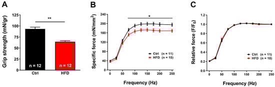 Grip strength and in-vitro specific force. (A) Grip strength normalized to body weight (in mN/gr). (B,C) Force frequency (1–250 Hz) curve of specific (panel (B)) and relative force normalized to 250 Hz (panel (C)) in isolated EDL muscles. Data are shown as mean ± SEM (* p < 0.05 and ** p < 0.01), as evaluated by two-way ANOVA followed by Tukey’s post-hoc test (panel (B)) or two-tailed unpaired Student’s t-test (panel A). n = number of mice tested (in panel (A)). n = number of EDL muscles tested (in panels (B) and (C)).