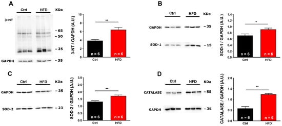Similar results were collected in the Soleus muscle, a predominantly slow twitch muscle (Figure S2): 2.0-fold increasing in 3-NT (Figure S2A), and ~40% (Figure S2B) and ~26% (Figure S2C) increase in SOD-1 and SOD-2, respectively. Finally, Catalase also showed increased levels in the HFD group: ~41% when compared with Ctrl (Figure S2D).