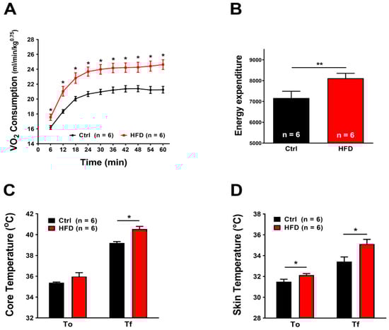 While in normal housing conditions, the basal metabolism of HFD mice was reduced compared to Ctrl, when we subjected mice to environmental heat stress (1 h at 41 °C), both BEE and VO2 consumption were surprisingly increased in HFD compared to Ctrl (Figure 5). Increased metabolism was also accompanied by increase in core and skin temperatures during the heat stress protocol (Figure 5). The greater increase in body temperature could be the result of two factors: (1) the increase in oxygen consumption and metabolism and (2) the increased amount of adipose tissue that, being an insulating tissue, could limit the dissipation of heat through the skin.