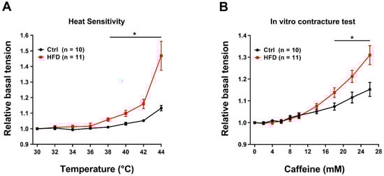When exposed to this protocol, EDL muscles excised from HFD mice showed a significant increase in basal tension starting from ~38 °C (Figure 6A), that at 44 °C became ~30% higher than in Ctrl. We performed similar experiment in Soleus muscles, also detecting a difference in heat sensitivity: increase in basal tension compared to Ctrl starting at ~40 °C (Figure S1C), with a relative basal tension at the end of the experiment (44 °C) which was ~15% higher in the Soleus from HFD compared to Ctrl.