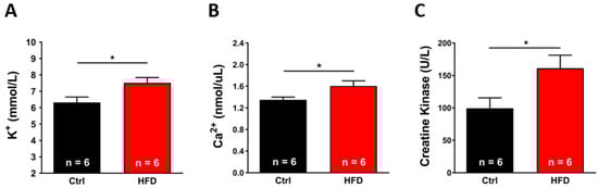 Immediately after heat stress, 100 μL of blood was collected from Ctrl and HFD mice’s tail vein, then transferred to 1.5 mL micro tubes, centrifuged at 3000× g for 15 min at 4 °C for plasma separation, and stored in 200 μL micro tubes at −20 °C until further use. Levels of potassium (Potassium turbidimetric assay kit, myBioSource, San Diego, CA, USA), calcium (Calcium colorimetric assay kit, Sigma-Aldrich, Burlington, MA, USA) ions, and creatine kinase activity (Creatine kinase activity assay kit, Sigma-Aldrich, Burlington, MA, USA) were quantified in plasma samples, following manufacturer’s instructions and expressed in mmol/L, units/L, and nmol/μL, respectively.