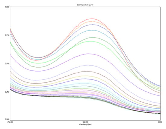 The changes in absorbance spectra of compound 4c during spontaneous hydrolysis. Spectrum was monitored for 250 min with 10 min intervals in 0.05 M phosphate buffer (pH 7.3, 25 °C).