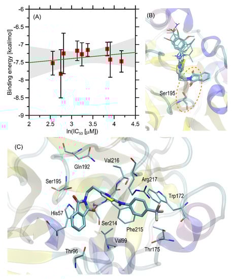 In our previous paper [49], we concluded that a good correlation of the binding energies with the IC50 values speaks for dependence of the inhibition properties on the stage of ligand alignment in the binding cavity before the subsequent reaction with Ser195. Here, the analogous correlation is not so obvious. Therefore, it is hard to draw a similar, unmistakable conclusion. Nevertheless, the consistent arrangement of the lowest-energy ligand poses, common for all considered compounds and all protein structures support the hypothesis about the contribution of Ser195 in covalent ligand binding.