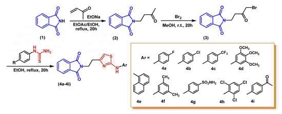 The synthetic pathway leading to compounds 4a–4i is shown in Scheme 1. In the first step, phthalimide 1 was reacted with methyl vinyl ketone in the presence of sodium ethoxide as a catalyst to obtain 2-(3-oxobutyl)phthalimide 2. In the next step ketone was brominated with bromine in methyl alcohol to give 2-(4-bromo-3-oxobutyl)phthalimide 3 [45,46,47]. In the last step using the Hantzsch reaction of bromoketone 3 with various thioureas, ten final compounds 4a–4i were obtained. The newly synthesized compounds were identified using spectroscopic methods, such as 1H NMR (700 MHz), 13C NMR (100 MHz) and ESI-HRMS analysis [see Supplementary Materials]. The 1H NMR spectra of compounds 4a–4i have four characteristic signals: two triplets derived from methylene groups at about 2.90 ppm and 3.90 ppm, thiazole-5H proton singlet at about 6.50 ppm and singlet of the NH group at 9.45–10.44 ppm. The structure of the newly synthesized compounds was also confirmed using 13C NMR spectra. The most characteristic signals were found at about 30 ppm and 37 ppm derived from the two methylene groups, and at about 105 ppm corresponding to the CH of the thiazole ring. The key signals are also those from the two carbonyl groups of the phthalimide ring at about 168 ppm.