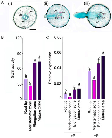 Expression pattern of OsSQD1 in rice roots. Histochemical analysis of the tissue-specific GUS staining (A) and activity (B) driven by OsSQD1 promoter (2028 bp upstream of its translation start codon). Cross-sections of OsSQD1 promoter-GUS fusion roots in (A) were meristematic zone (i), elongation zone (ii), and mature zone (iii) from left to right. co, en, xy, and ph refers to cortex, endodermis, xylem, and phloem, respectively. Bars represent 100 μm. (C) The relative expression of OsSQD1 in root tip, meristematic zone, elongation zone, and mature zone of roots under different +P and −P conditions. Actin (OsRac1; LOC_Os03g50885) was used as an internal control. Values (B,C) are means ± SE (n = 3) and different letters on the histograms indicate that the values differ significantly (p < 0.05, one-way analysis of variance).