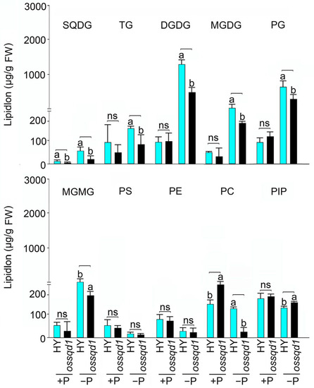 OsSQD1 altered concentration of different lipid species in roots under different Pi regimes. The concentrations of different species of lipids in WT and ossqd1 mutant roots under +P and −P conditions. SQDG, sulfoquinovosyldiacylglycerol; TG, triglyceride; DGDG, digalactosyldiacylglycerol; MGDG, monogalactosyldiacylglycerol; PG, phosphatidylglycerol; MGMG: monogalactosylmonoacylglycerol; PS, phosphatidylserine; PE, phosphatidylethanolamine; PC, phosphatidylcholine; PIP: phosphatidylinositol-4-monophosphate. Lipidlon replaces the concentration of lipid molecule. Values are means ± SE (n = 4) and different letters on the histograms indicate that the values differ significantly between WT and ossqd1 mutant. (p < 0.05, one-way analysis of variance, Duncan’s test). ns = not significant.