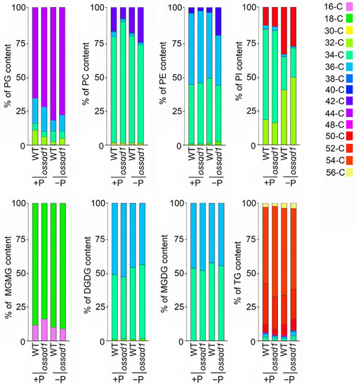 To better visualize the changes in different lipid compositions, the proportion of different lipid species with various acyl chain lengths under +P and −P conditions in the ossqd1 mutant is shown in Figure 4. Under Pi sufficiency, the proportion of 32-C PG was slightly decreased while 44-C PG was increased in ossqd1 mutant roots compared with WT. Additionally, mutation of OsSQD1 caused an increase in the 34-C PC proportions together with a significant decrease in 42-C PC. Nevertheless, the composition of phospholipids in ossqd1 mutant roots was quite different from that in WT roots under Pi deficiency (Figure 3). The proportion of 36-C PG out of the total PG increased at the expense of 34-C PG in ossqd1 mutant roots. There was a slight decrease in the 34-C PC together with the increased proportion of 42-C PC. For PE, the proportion of 36-C PE was strongly decreased, while that of 40-C PE was induced in ossqd1 mutant roots under −P conditions. As observed for PG and PC, the proportion of 32-C PI was increased in Pi-deprived roots of the ossqd1 mutant. Meanwhile, mutation of OsSQD1 reduced the proportion of 50-C PI under −P conditions (Figure 3). Among glycolipids, the most obvious change in ossqd1 mutant roots was observed for the composition of MGDG and DGDG under −P conditions. The proportion of 32-C MGDG and DGDG increased together with a slight decrease in 34-C MGDG and 36-C DGDG in Pi-deprived roots of the ossqd1 mutant (Figure 3). In addition, the proportions of 34-C and 36-C TG were increased in the ossqd1 mutant compared with WT (Figure 3).