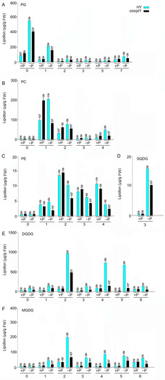Lipids are the major components of prokaryotic and eukaryotic membranes [6]. As well as being the structural components of the plasma and cell intracellular membrane, they also perform a variety functions in signal transduction, stress response, and carbon storage, as well as biological functions in terms of being a source of energy [7]. Plant cells contain many different types of lipids, such as glycolipids, sterol lipids, phospholipids, waxes, sphingolipids, and fatty acids. Phospholipids mainly include phosphatidylglycerol (PG), phosphatidic acid (PA), phosphatidylinositol (PI), phosphatidylcholine (PC), phosphatidylserine (PS), and phosphatidylethanolamine (PE) in higher plants [8,9,10,11]. They contain two fatty acids esterified to the sn-1 and sn-2 positions of the glycerol backbone and a polar headgroup attached to the sn-3 position [12]. Glycolipids, such as monogalactosyldiacylglycerol (MGDG), digalactosyldiacylglycerol (DGDG), and sulfoquinovosyldiacylglycerol (SQDG), have glycerol backbones with two fatty acid molecules at the sn-1 and sn-2 positions, and have either a phospholipid or a sugar molecule at the sn-3 position. Under conditions of Pi starvation, membrane phospholipids can be replaced by nonphosphorus glycerolipids to release more Pi catalyzed by phospholipases [13,14]. This transformation in lipid metabolism occurs in many species of bacteria, Arabidopsis (Arabidopsis thaliana), and rice (Oryza sativa L.) [15,16,17,18,19,20,21,22,23]. The decrease in phospholipids under conditions of Pi deficiency and their replacement with glycolipids were first discovered in the nonphotosynthetic bacterium Pseudomonas diminuta [15]. Subsequently, this mechanism was also found in the photosynthetic purple bacterium Rhodobacter sphaeroides, the cyanobacterium Synechococcus sp. PCC7942, Chlamydomonas reinhardtii, Oleaginous microalga and Nannochloropsis oceanica [16,17,21,22]. For higher plants, previous studies have shown that Pi deficiency strongly reduces the relative contents of PE, PC, and PG, and induces DGDG and SQDG contents in Arabidopsis shoots [18,19,20]. During leaf development in Hakea prostrata1 under Pi starvation, mature leaf blades showed delayed greening and decreased chloroplast size or quantity, and extensive lipid remodeling in the course of development by the up- and down-regulation of PG and nonphosphorus glycolipids [24]. Pi-starved rice increased the SQDG, DGDG, and MGDG contents to replace the decreasing PG, PC, PE and PS in shoots [23]. This mechanism leads to the maintenance of fundamental development processes upon Pi deficiency [25,26].