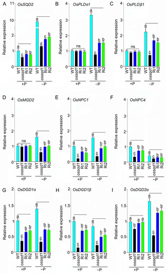 Mutation of OsSQD1 altered the composition of PG, PC, PE, PI, DGDG, MGDG and TG in Pi-deprived roots (Figure 3 and Figure S3). SQD2 is the sulfoquinovosyltransferase catalyzing the final step in the SQDG biosynthetic pathway [43,54]. The OsPLD (phospholipase D) family encodes rice phospholipases, hydrolyzing phospholipids to generate PA and a free radical [55]. NPC4 (a nonspecific phospholipase C) produces DAG that is converted to PA, affecting the C18/C16 of DAG in Arabidopsis and playing a positive role in root growth [56]. OsMGD2 is the MGDG synthase (MGD) that is significant for the accumulation of MGDG [57]. It can transfer a galactosyl residue from UDP-Gal to diacylglycerol [58,59,60]. In Arabidopsis, the enzymes MGD2 and MGD3 preferentially synthesize 16:0 and 18:2 MGDG, while DGD2 preferentially uses 16:0 [38,39]. Our data showed that the knockout/down of OsSQD1 downregulated the relative expression of OsSQD2, OsPLD1α, OsPLD1β, OsMGD2, OsNPC4, OsDGD1α, OsDGD2α and OsDGD1β upon Pi deprivation (Figure 6). This indicates that the lipid species’ composition alteration in ossqd1 mutant roots during Pi deficiency may be the result of changes in enzymatic reactions.
