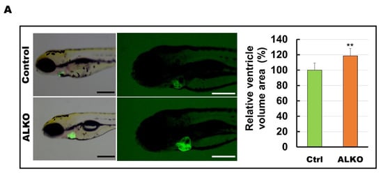 Depletion of ATGL interferes with the metabolic state and contributes to cardiomyopathy [17,45]. We hypothesized that Atgl might play a vital role in myocardial protection in our zebrafish model. Hence, we next examined whether Atgl deficiency altered the size of the ventricle in ALKO. The ventricular volumes of ALKO were slightly increased (1.2-fold) compared to those of the control group (Figure 4A). The histological sections and lateral views of the hearts of ALKO zebrafish revealed a typical phenomenon of cardiac hypertrophy compared to the wild type (Figure 4B). As expected, the expression levels of sarcomere molecules including myosin heavy chain 7-like (myh7l), actin alpha cardiac muscle 1b (actc1b), myosin binding protein C3 (mybpc3), and troponin T type 2a (tnnt2a), which served as biomarkers of myocardial function, decreased significantly (Figure 4C). Taken together, these results indicate that Atgl deficiency leads to a dramatic elevation of ventricular volume in zebrafish.