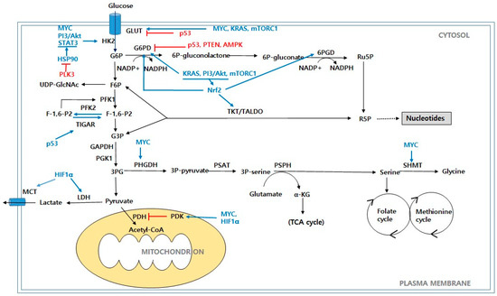 Other than genetic mutations in the oncogenes, the signaling pathway is constitutively activated in most cancers through subsequent genetic modification [21,22]. The oncogenes of the EGFR signaling pathway generally activate the cancer metabolism including anaerobic glycolysis as a result of the cell cycle activation in which Myc exerts the final role [30]. Myc, which is the final effector of the EGFR signaling pathway, promotes glycolysis by inducing the expression of glucose transporter1 (GLUT1) and lactate dehydrogenase A (LDHA) and by upregulating the glycolytic enzymes, including hexokinase 2 (HK2), phosphofructokinase (PFK), and pyruvate dehydrogenase kinase 1 (PDK1) [31,32]. Moreover, most cancers are exposed to hypoxia [33]. In hypoxia, hypoxia-inducible factor 1α (HIF-1α) dimerizes with HIF-1β and accumulates in the nucleus. The HIF-1 dimer, which is the complex of HIF-1α and HIF-1β, then binds to the hypoxia response elements (HREs) and activates the regulatory genes involved in glycolysis [34,35]. These genes include the glucose transporter GLUT1, glycolytic enzyme HK2, phosphofructokinase-1 (PFK1), fructose-bisphosphate aldolase A (ALDOA), phosphoglycerate kinase 1 (PGK1), pyruvate, pyruvate kinase (PK), and the enzymes related to lactate production, extrusion LDHA, and monocarboxylate transporter 4 (MCT-4) [36,37]. HIF-1 inactivates pyruvate dehydrogenase (PDH) via the upregulation of PDH kinases (PDKs), which inhibit the transformation of pyruvate into acetyl-CoA [38]. Researchers have observed crosstalk between Myc and HIF, and this interplay promotes cancer cell survival and growth [39]. A key tumor suppressor, p53, also plays an important role in the regulation of cellular metabolism [40]. p53 regulates the glucose absorption by repressing GLUT1 and GLUT4, as well as GLUT3 through the inhibition of nuclear factor kB (NF-ĸB) signaling [41]. p53 suppresses the MCT1 expression to inhibit the transportation of lactate [42]. In addition, p53 inhibits glycolysis through the transcriptional activation of Parkin, which degrades HIF-1α, or by downregulating HK2 [43,44]. The phosphoinositide 3-kinase (PI3K)/Akt pathway, which is one of the most frequently dysregulated pathways in cancer, is activated in response to growth factors, insulin, and cytokines and it controls key metabolic processes [45]. PI3K/Akt promotes glucose uptake and glycolysis by increasing the glucose transporter expressions such as those of HK and PFK1 [46]. HIF-1α regulates glycolysis via the PI3K/Akt/mTOR signaling pathway [47]. Tumor suppressors, such as phosphate and tension homolog (PTEN) and p53, suppress the metabolic adaptation through the negative activation of the PI3K/Akt and MAPK/ERK pathways [48,49]. Recent studies provide evidence for associations with polo-like kinases (PLKs) in regulating cancer progression, apoptosis, and metabolic processes [50,51]. The PLKs, which belong to a family of highly conserved serine/threonine kinases, comprise all five members (PLK1-5) [50]. PLKs and signal transducer and activator of transcription 3 (STAT3) exhibit cross-regulatory interactions in human cancers. PLK1 promotes the migration of lung cancer cells via STAT3 signaling [52]. Furthermore, PLK3 binds to the heat shock protein 90 (HSP90) and facilitates its degradation, which leads to a decrease of phosphorylated STATS. The STAT3 dephosphorylation further inhibits the transcriptional activation of HK2, resulting in a lower glycolytic rate in colorectal cancer [53].