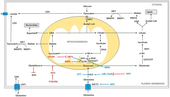 Schematic representation of glutamine contribution to cancer cells metabolism. Abbreviations: ASCT2: alanine-serine-cysteine-transporter-2; LAT1: L-type amino acid transporter; GLS: glutaminase; GLUD: glutamate dehydrogenase; α-KG: α-ketoglutarate; OAA: oxaloacetate; IDH1: isocitrate dehydrogenase 1; IDH2: isocitrate dehydrogenase 2; ME1: malic enzyme; LDH: lactate dehydrogenase; ROS: reactive oxygen species; MPC: mitochondrial pyruvate carrier; MDH1: malate dehydrogenase; NEAA: nonessential amino acid; EAA: essential amino acid; NH4+: free ammonia; PI3K/Akt: phosphoinositide 3-kinase/protein kinase B; mTORC1: mammalian target of rapamycin complex 1; Myc: c-Myc; KRAS: Kirsten Ras GTPase; Nrf2: nuclear factor erythroid-2-related factor 2; SIRT4: Sirtuin 4.