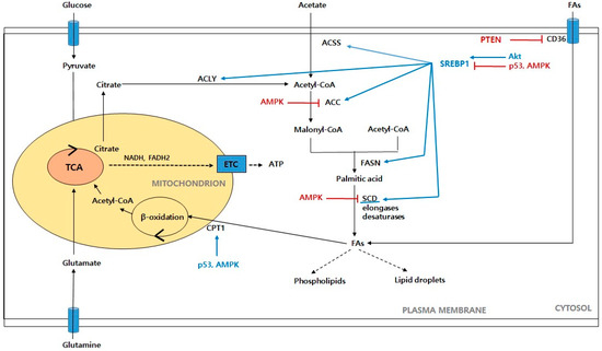 Schematic representation of fatty acid metabolism in cancer cells. Glucose-derived pyruvate enters the mitochondria to form citrate, which then moves to the cytoplasm and contributes to the de novo synthesis of fatty acids. Acetate is also another source of lipogenesis. When cellular fatty acids are in excess, the fatty acids absorbed through CD36 are converted into lipid droplets and are made available when needed. Acetate also provides reducing equivalents, such as NADH and FADH2 through β-oxidation. Finally, ATP is generated from the ETC. Abbreviations: ACSS: acetyl-CoA synthetase; ACLY: ATP citrate lyase; ACC: acetyl-CoA carboxylase; FASN: fatty acid synthase; SCD: stearoyl-CoA desaturase; FAs: fatty acids; CPT1: carnitine palmitoyl transferase 1; ETC: electron transport chain. Akt: protein kinase B; AMPK: AMP-activated protein kinase; PTEN: phosphate and tension homolog; SREBP1: sterol regulatory element-binding proteins.
