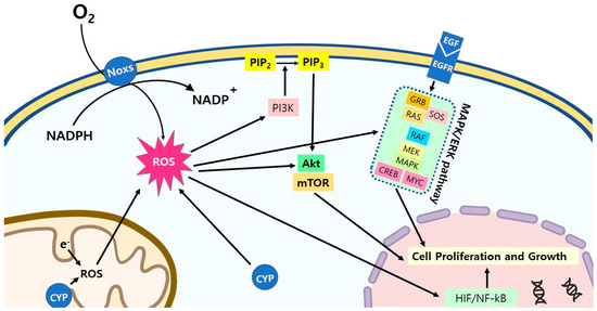 ROS signaling pathways in cancer cells. ROS activate multiple signaling pathways in cancer cells for the stimulation of the cell proliferation and growth. Abbreviations: CYP: cytochrome P450; PI3K: phosphoinositide 3-kinases; PIP2: phosphatidylinositol 4,5-bisphosphate; PIP3: phosphatidylinositol (3,4,5)-trisphosphate; AKT: protein kinase B; mTOR: mammalian target of rapamycin; EGF/EGFR: epidermal growth factor/epidermal growth factor receptor; GRB: growth factor receptor-bound protein; SOS: Son of Sevenless; RAS: Ras GTPase; RAF: RAF kinase; MEK: mitogen-activated protein kinase; MAPK: mitogen-activated protein kinase; CREB: cAMP response element-binding protein; MYC: c-MYC; HIF: hypoxia-inducible factors; NF-κB: nuclear factor kappa B.
