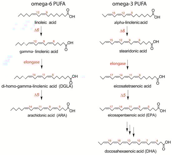 Fatty acids are distinguished by their structures into saturated, monounsaturated, and polyunsaturated families (SFA, MUFA, and PUFA), with an important dietary dependence on PUFAs, which are not directly produced by human metabolism. The omega-6 (ω-6) and omega-3 (ω-3) precursors, linoleic and alpha-linolenic acids, are processed after intake by desaturase and elongase enzymes to form long-chain PUFAs (LC-PUFAs), as shown in Figure 1 [5].