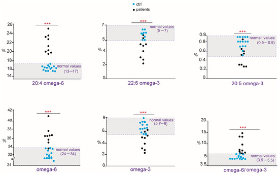 Scattered dot plots of fatty acids, families, and indexes significantly changed in peanut-allergic patients (black dots) compared with healthy controls (blue dots). Data are reported in Table 2. The benchmark of interval values in healthy population is highlighted in light gray in the graphs. p-values, *** ≤ 0.0001.
