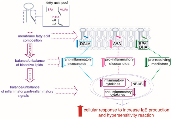 The individual fatty acid pool, derived from diet and metabolism, influences the formation of phospholipids, and an unbalance occurs in allergic patients among dihomo-gamma-linolenic acid (DGLA), arachidonic acid (ARA), eicosapentaenoic acid (EPA), and docosahexaenoic acid (DHA) residues present in cell membranes. The fatty acid composition has impact on formation of bioactive lipids and balance/unbalance of transcription factors (NF-kB, among others) for the production of inflammatory/anti-inflammatory cytokines influencing the cellular IgE production and the final hypersensitivity reaction.