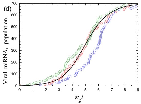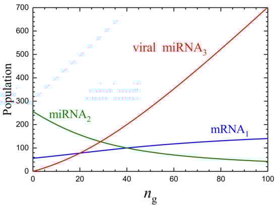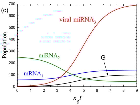 mRNA, miRNA, miRNA, and G and populations as a function of according to Equations (19) and (20) with for (a), 50 (b), and 100 (c) and the other parameters (, , , and ) as in Figure 1. In this model, the infection of a cell is possible by one virion [], in agreement with the so-called independent action hypothesis [40]. In the absence of virus ( and ), the mRNA and miRNA population are and (Figure 1).