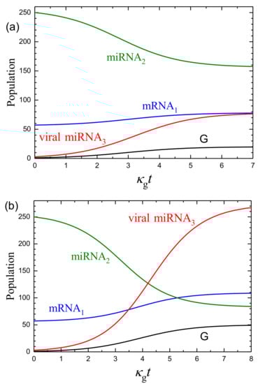 To illustrate the effect of the variation of parameters on the kinetics, it is instructive to increase the rate constants of the formation of mRNA, miRNA, and miRNA by one order of magnitude up to , , and and to keep other parameters the same as above ( and ). In this case, the initial miRNA population becomes larger, roughly by one order of magnitude (cf. Figure 2b and Figure 3). The initial mRNA population increases only by a factor of 2 because the increase in is compensated by the increase in the initial miRNA population. Globally, the kinetics are qualitatively the same. Quantitatively, the final relative increase in the mRNA population and decrease in the miRNA population (compared to the initial values) are more appreciable.