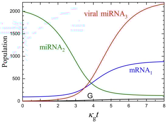 The coarse-grained model introduced above is focused on five key species, including cellular mRNA, P, and miRNA; viral miRNA; and G. Equations (19) and (20) for the corresponding populations, , , , , and , contain many kinetic parameters. In principle, the model can be used in order to describe real kinetics of infection of individual cells, and ideally, the parameters can/should be specified by using independent experiments. In practice, with the current state of the art, this is impossible because the available experimental data are far from sufficient. Under such circumstances, my goal is less ambitious. Specifically, I focus on the typical shape of the kinetics under consideration with biologically reasonable populations of various species. Following this line, I show below the populations of cellular mRNA and miRNA, and ; viral miRNA, ; and G, . The P population, (in (19)), is not shown, because this population is just proportional to the mRNA population.