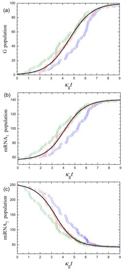The steady-state dependence of the mRNA, miRNA, and miRNA populations, , , and , on the G population, , predicted by (19), with the chosen values of the kinetic parameters is shown in Figure 1. The temporal mean-field kinetics under consideration; or more specifically, the mRNA, miRNA, miRNA, and G populations calculated according to Equations (19) and (20) as a function of are exhibited in Figure 2.