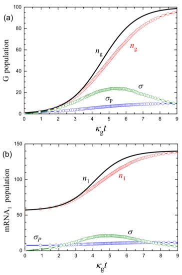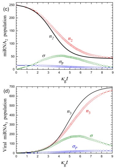 The simulations show that for G replication, is close to in the beginning and end of the kinetics, and larger than by a factor of three in the medium, where the G growth is fastest (Figure 5a). The miRNA population is directly dependent on the G population, and here is much larger than (Figure 5d). The mRNA and miRNA population are indirectly dependent on the G population, and for them is smaller than in the beginning, smaller than or comparable to in the end, and appreciably larger than in the medium of the kinetics (Figure 5b,c). Thus, the scales of the maximal fluctuations of the mRNA, miRNA, and miRNA populations are rather appreciable compared to . As already noticed, the reason for this feature is that the fluctuations of the populations of these species are related directly or indirectly to those of the G population. The latter population is relatively small, the fluctuations of this population with respect to its average value (the corresponding measure is ) are relatively large, and accordingly, the fluctuations of other populations are large as well.