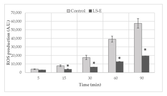 Inhibition of ROS production of blood leukocytes stimulated by PMA and incubated with or without LS-E (50 µg/mL). Results are presented as mean and standard error, n = 4, *: p ≤ 0.05.