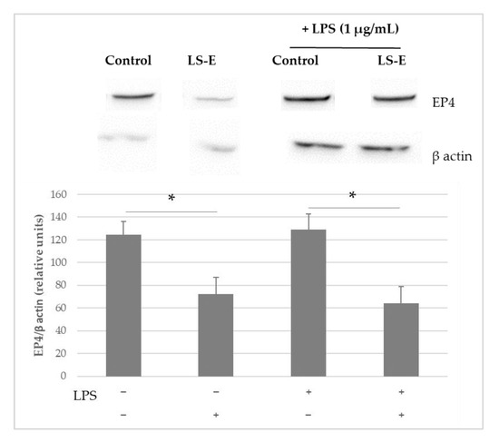 Western blot of EP4 in THP-1 incubated with LPS (1 µg/mL) and with or without LS-E (50 µg/mL) for 1 h; n = 4, *: p ≤ 0.05. Results were expressed as EP4/β actin ratio and control was normalized to 100%, mean values and standard error are given, n = 5.
