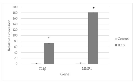 Relative gene expression (expressed as fold change) of IL1β-activated NHAC-kn in monolayers (vs. cells incubated without IL1β) n = 4. Mean values and standard error are given. *: p ≤ 0.05.