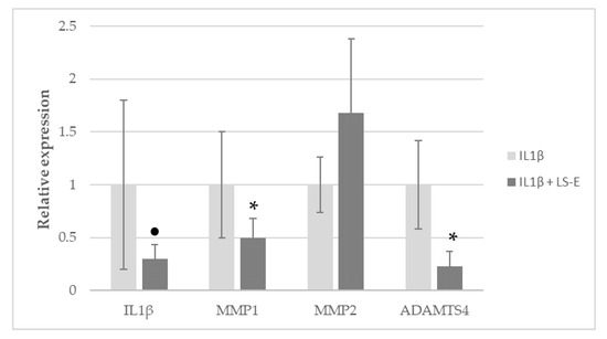 Relative gene expression (expressed as fold change, mean ± standard error) of activated NHAC-kn in alginate beads, incubated with LS-E and IL1β for 4 h (vs. control, cells incubated with IL1β and without LS-E). n = 4. *: p ≤ 0.05, ●: 0.1 > p > 0.05. ↓: Decrease of gene expression with LS-E (p < 0.1).