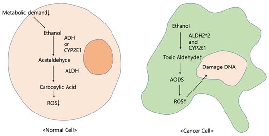 The primary alcohol is typically metabolized in two steps in the liver [174]. First, ethanol is oxidated to acetaldehyde through enzymes such as ADH and cytochrome P2E1 (CYP2E1) [175]. With ALDH, acetaldehyde is additionally metabolized to acetate as a further step [176,177]. Above all, the results of these reactions depend on the enzymes; even acetaldehyde, which is toxic [178,179,180] and carcinogenic, has the potential to accumulate [176]. This accumulation has grave implications for DNA, suppressing DNA repair and damaging the antioxidative defense system (AODS) [181,182].